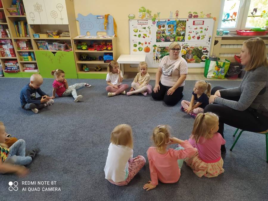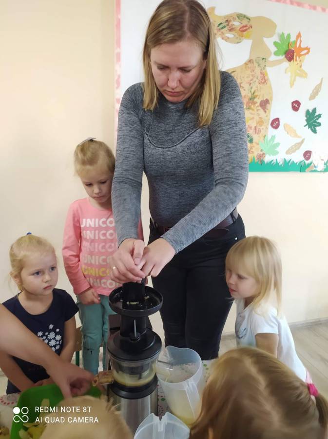 Wizyta pani Małgorzaty Kryckiej - Bartnik w grupie Krasnali i krótka prelekcja na temat tłoczenia soków owocowych, wykonanie z dziećmi soków.