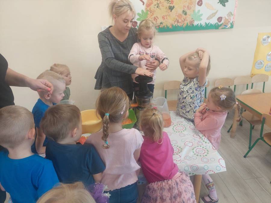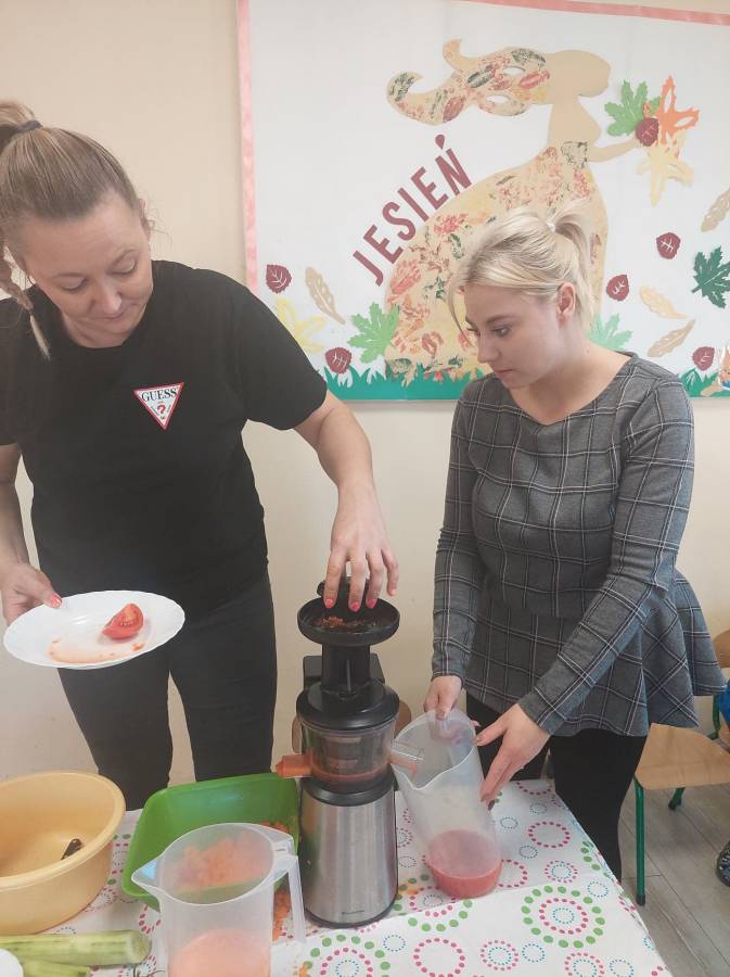 Katarzyna Galuba zaprosiła grupę w niezwykłą podróż w pokoleniowe tajniki robienia zapasów w rodzinie gościa oraz wykonała z dziećmi soki warzywno - owocowe.