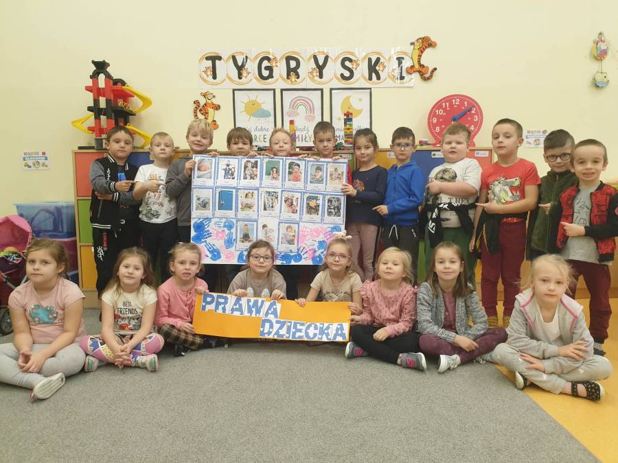 Miedzynarodowy Dzień Praw Dziecka. 20 listopada to wyjątkowy dzień ? rocznica uchwalenia Konwencji o prawach dziecka. Tygryski 21 listopada wzięły wspólnie udział w zajęciach o tej tematyce. Dzieci oglądały prezentację multimedialną pt. ,,Nasze prawa?, poznały ?Konwencję o Prawach Dziecka? i miały okazję, dowiedzieć się o tym, że mają liczne prawa min.: prawo do życia, radości, uśmiechu, zabawy, odpoczynku, wyrażania własnej opinii, spokojnej nauki, opieki medycznej, ciekawego poznawania otaczającego nas świata itd. Przedszkolaki za pomocą odcisku ręki dały dobry przykład o tym, że znają swoje prawa. Tygryski tańczyły przy piosence " o prawach dziecka?, wycinały obrazki przedstawiające prawa dziecka z których stworzyły plakat. Mamy nadzieję, że wiedza o prawach dziecka plus poczucie własnej wartości, oraz świadomość swoich praw i również obowiązków da dzieciom dobre podstawy do bycia w przyszłości wspaniałym człowiekiem.