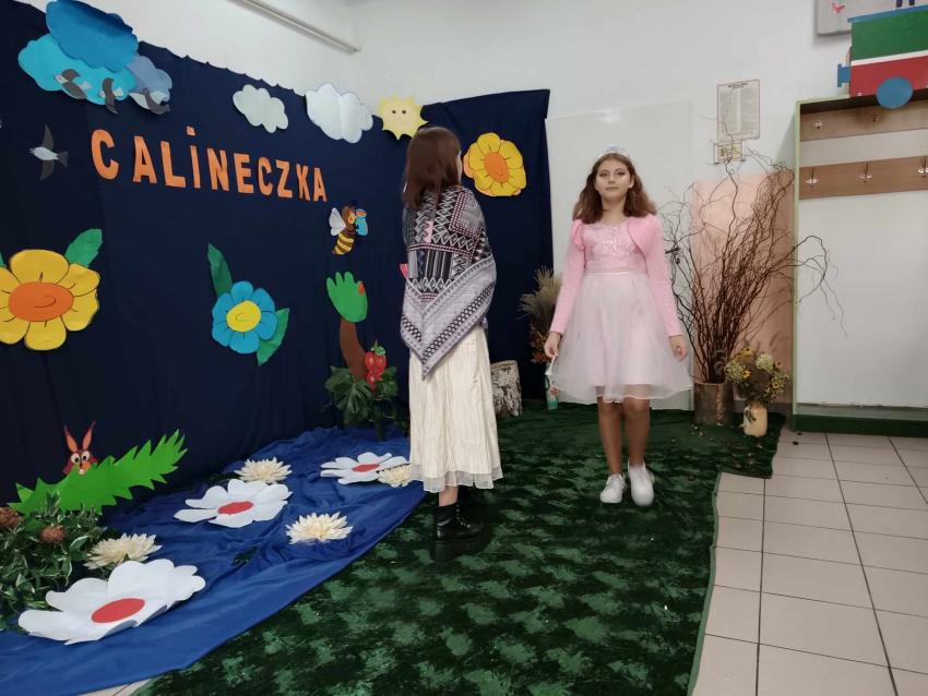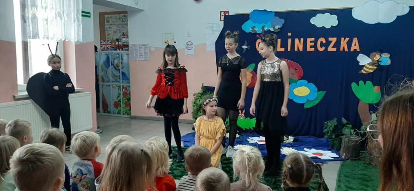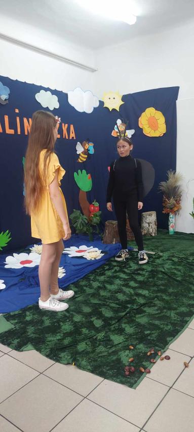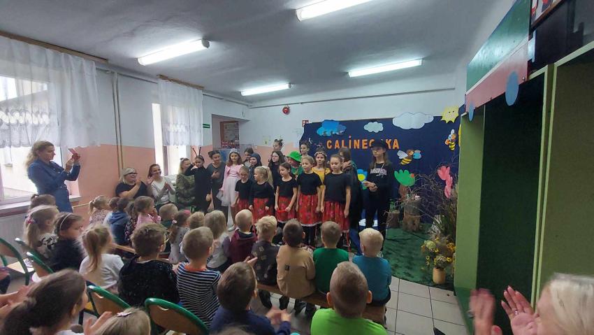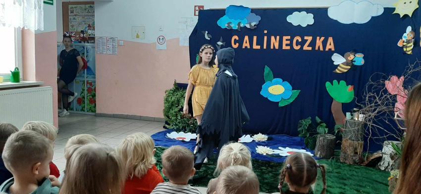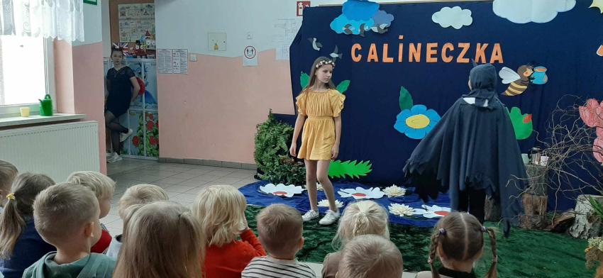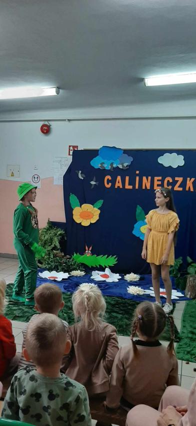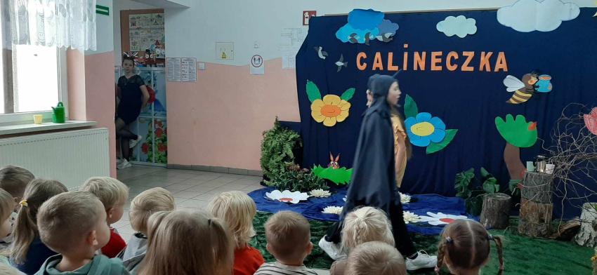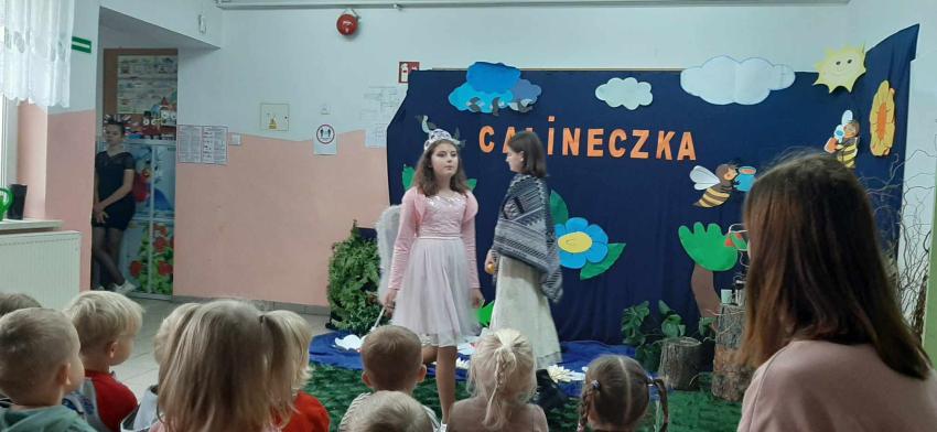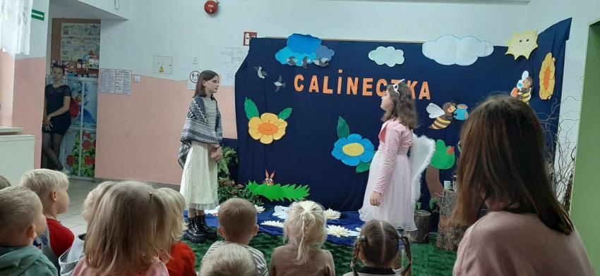 Dzieci z naszego przedszkola dostały zaproszenie na spektakl ?Calineczka?. Przedstawienie przygotowały dzieci z kółka aktorskiego Szkoły Podstawowej im. A. Chodyńskiego w Cekowie - Kolonii. Pod przewodnictwem pani Izabeli Skoniecznej - Przybył młodzi aktorzy przygotowali piękną scenerię, kostiumy, charakteryzację. Dzieci z wypiekami na twarzy oglądały interpretację baśni. Aktorzy dostali gromkie brawa. Serdecznie dziękujemy za zaproszenie i docaniamy trud włożony w przygotowanie tak pięknego przedstawienia.
