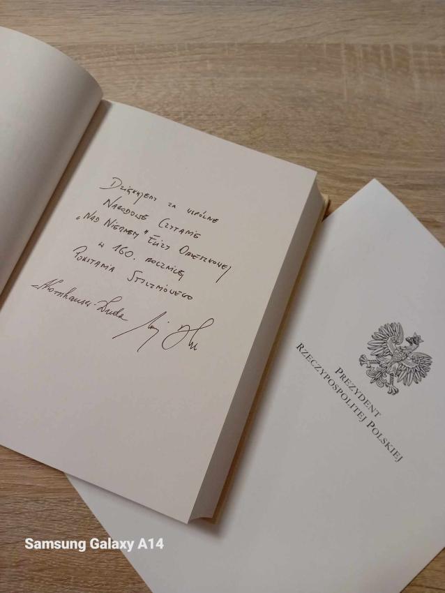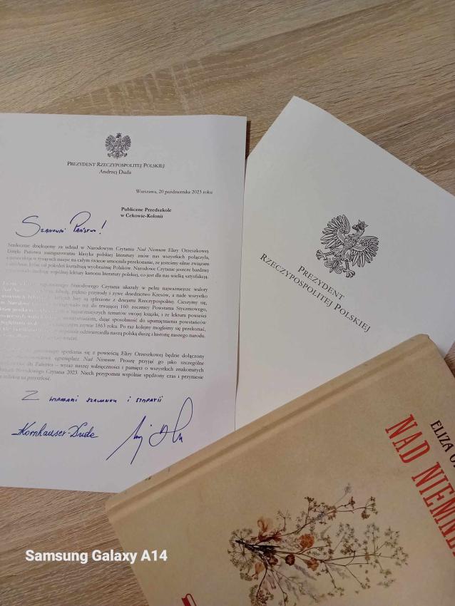 W podziękowaniu za udział w narodowym czytaniu nasza placówka otrzymała list od Prezydenta RP wraz z egzemplarzem książki ?Nad Niemnem?.