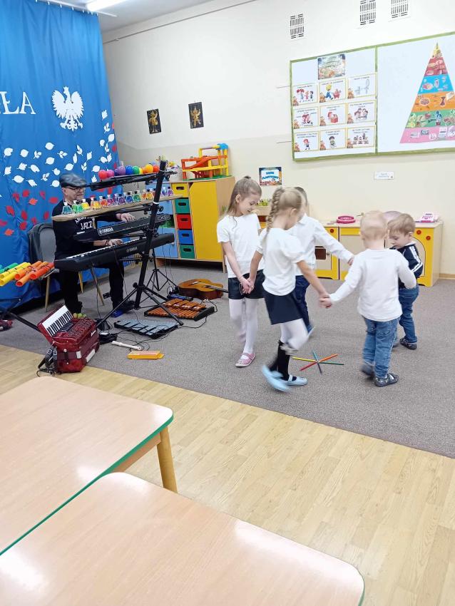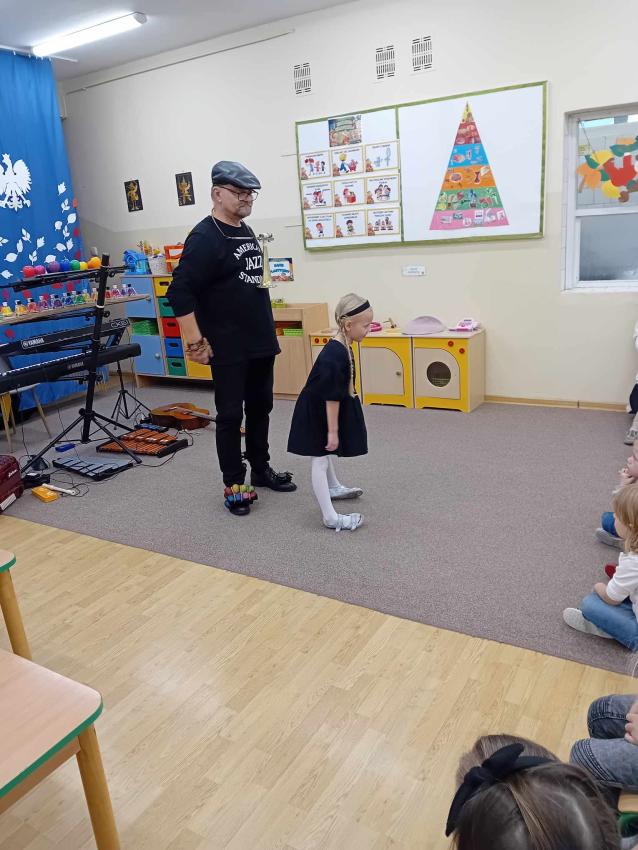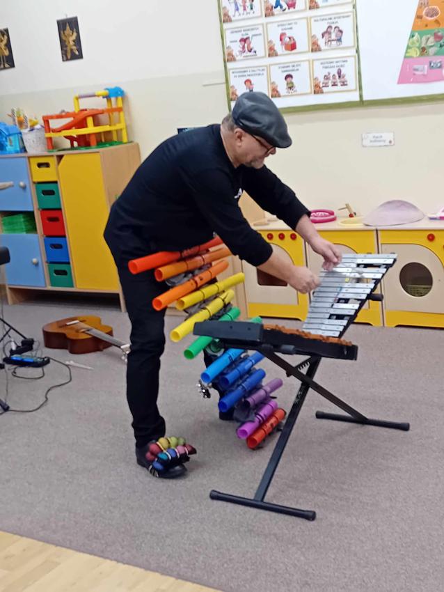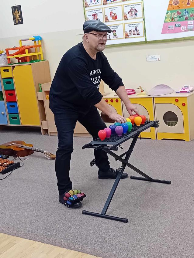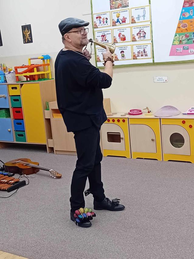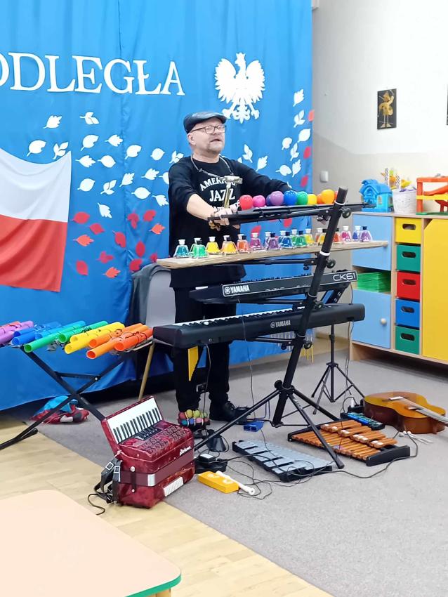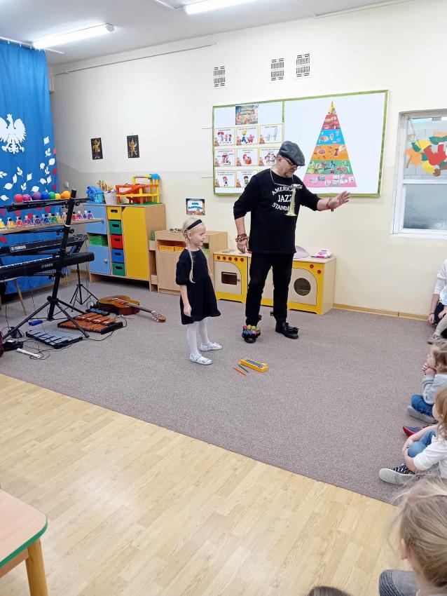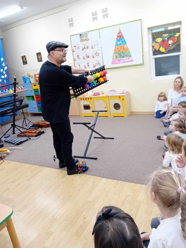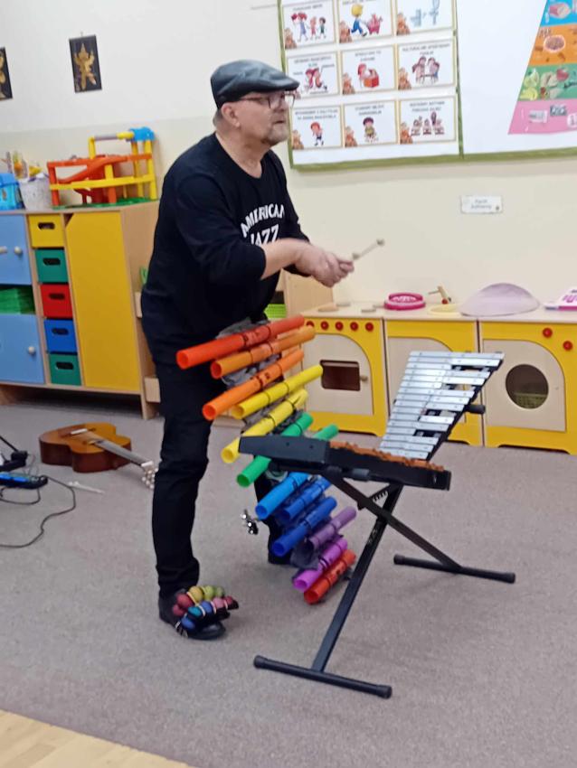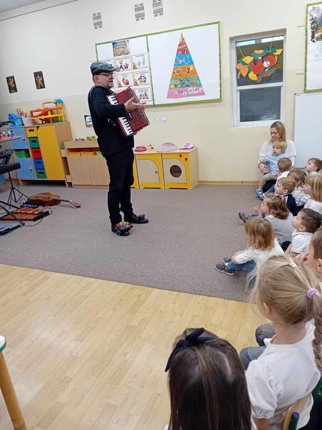 W piatek 8 listopada naszych milusińskich odwiedził Pan Wiesław Pyzalski, zwany też człowiekiem - orkiestrą. W przyjazny i ciekawy sposób zapoznał dzieci z różnymi instrumentami, opowiadał o każdym instrumencie, grał znane dzieciom utwory. Nie zabrakło także wspólnych zabaw i tańców. Dzieci z zaangażowaniem i zaciekawieniem brały udział we wspólnej muzycznej przygodzie, jaką było spotkanie z człowiekiem - orkiestrą.