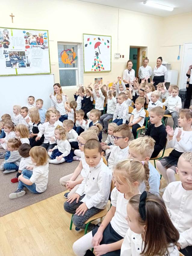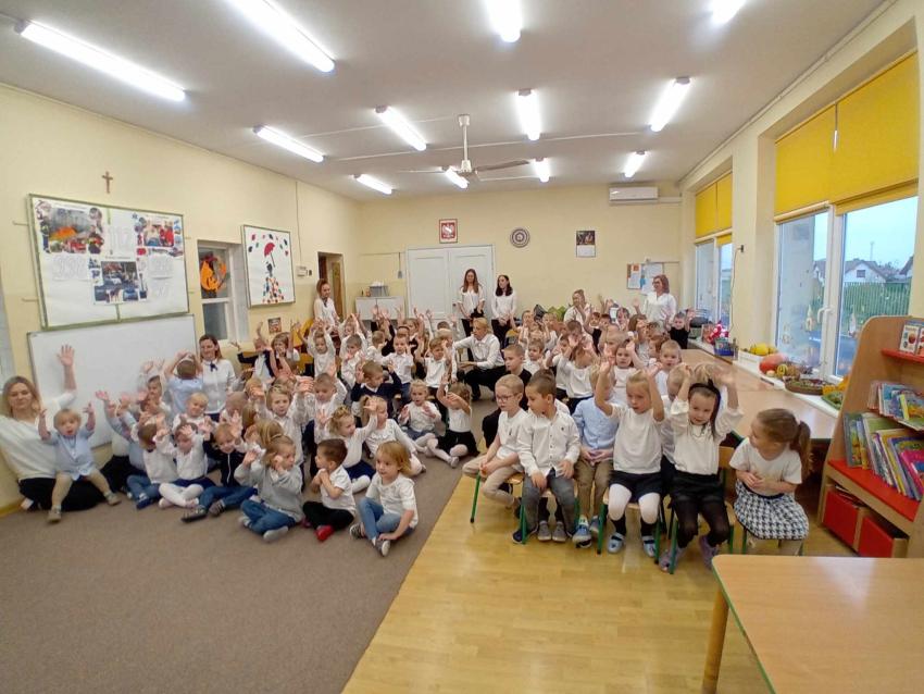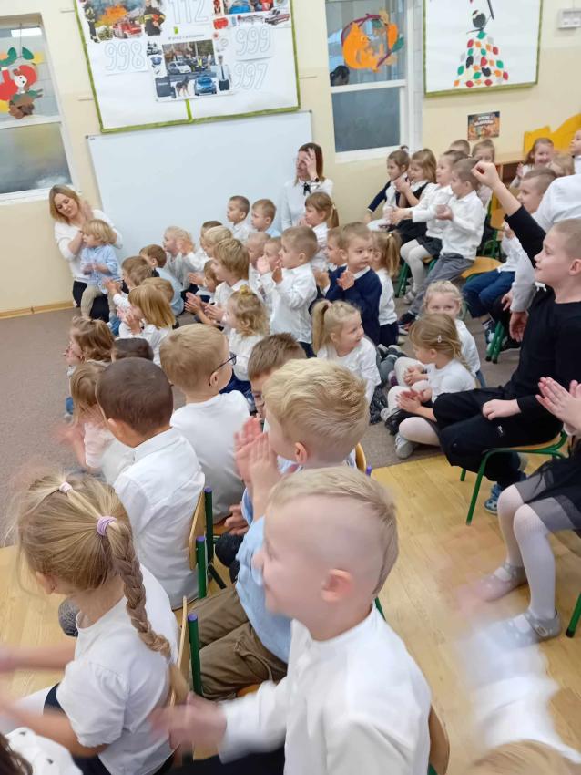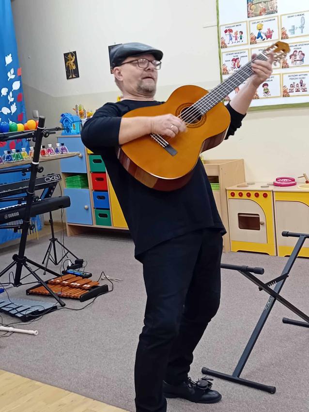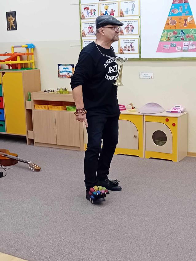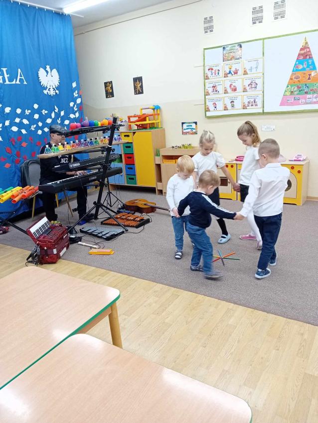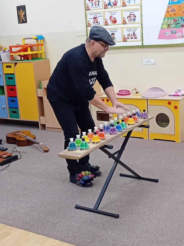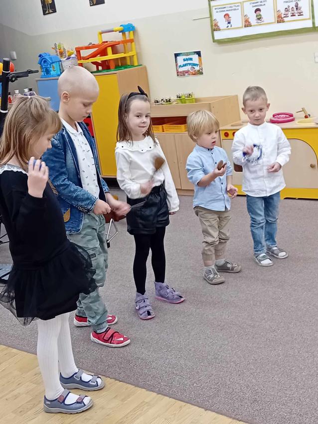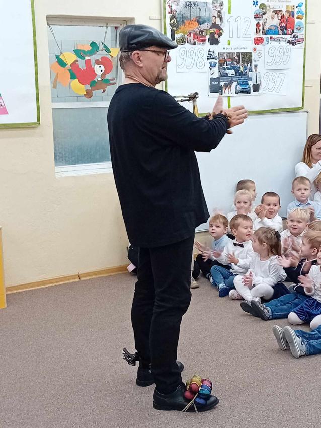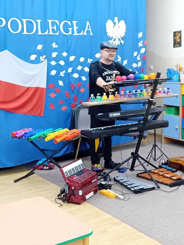W piatek 8 listopada naszych milusińskich odwiedził Pan Wiesław Pyzalski, zwany też człowiekiem - orkiestrą. W przyjazny i ciekawy sposób zapoznał dzieci z różnymi instrumentami, opowiadał o każdym instrumencie, grał znane dzieciom utwory. Nie zabrakło także wspólnych zabaw i tańców. Dzieci z zaangażowaniem i zaciekawieniem brały udział we wspólnej muzycznej przygodzie, jaką było spotkanie z człowiekiem - orkiestrą.