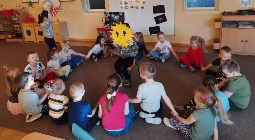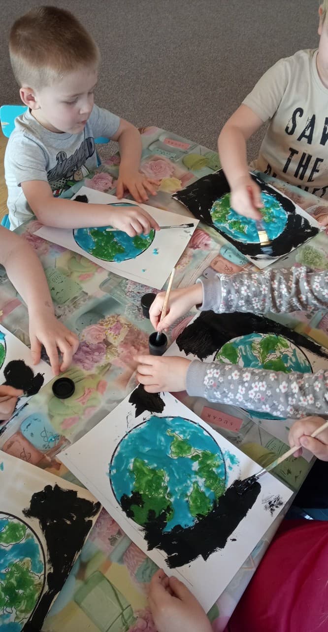 Zabawa "Ziemia krąży wokol słońca" i planeta Ziemia wykonana rosnącymi farbami