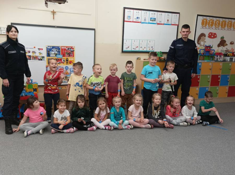 W piątek 4 listopada dzieci z grupy Krasnale, Skrzaty oraz Gumisie odwiedzili funkcjonariusze policji. Ich wizyta związana była z omawianymi przez przedszkolaki tematami dotyczącymi bezpieczeństwa. Dzieci poznawały znaczenie niektórych  znaków drogowych, utrwalały numery telefonów alarmowych, dowiedziały się co to są pojazdy uprzywilejowane, uczyły się właściwego postępowania w sytuacjach zagrożenia. Przedszkolaków odwiedził pan Mateusz Ludwiczak oraz pan Konrad Juszczak z posterunku w Koźminku.  Dzieci utrwaliły zdobyte wiadomości, a także miały okazję wybrać się na spacer, podczas którego policjant uczył ich zasad prawidłowego przechodzenia przez jezdnię. Dzieci otrzymały także upominki - odblaski oraz opaski.  Obu funkcjonariuszom serdecznie dziękujemy za odwiedziny.