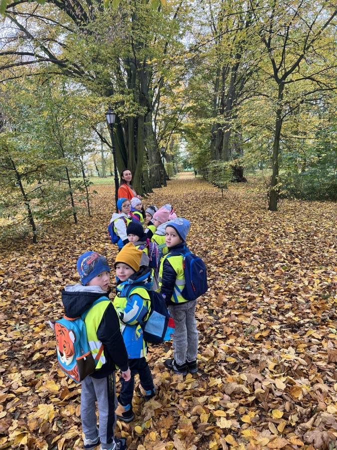 Dnia 24 października ?Skrzaty? wykorzystując piękną pogodę i uroki jesieni wybrały się na wycieczkę do parku w Koźminku. Podziwialiśmy jesienne barwy, rosnące krzewy i drzewa, słuchaliśmy odgłosów przyrody. Za pomocą lup przyglądaliśmy się korze drzew, liściom i bacznie wypatrywaliśmy przez lornetkę zwierzęta żyjące w parku, szukaliśmy również ich domów.  Przy okazji  zwiedziliśmy ?Dworek Andrzeja Mielęckiego?, który znajduje  się właśnie w parku i poznaliśmy jego historię. Dworek na obecną chwilę pełni funkcję Gminnego Centrum Kultury. W parku spotkaliśmy grupę przedszkolaków z zaprzyjaźnionego przedszkola w Koźminku, z którymi spacerem udaliśmy się do ich placówki. Tam miło spędziliśmy czas na wspólnej zabawie.