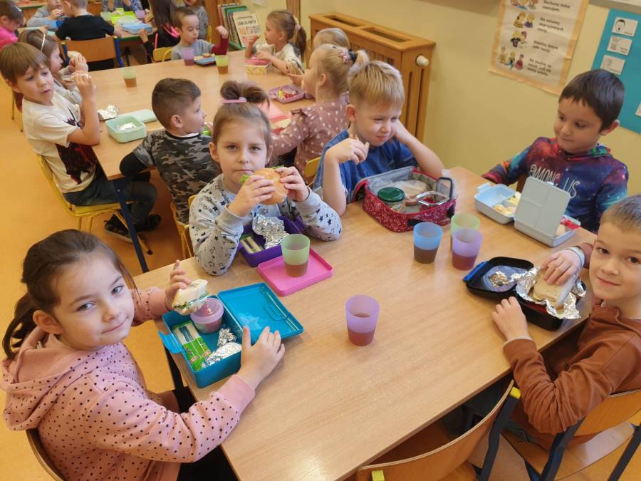 Dzień Zdrowego Śniadania. Święto te jest nowym dniem w naszych kalendarzach, bo dopiero od kilku lat. Jego ustanowienie jest odpowiedzią na rosnący problem otyłości wśród dzieci oraz ogólne zniechęcenie do wczesnego jedzenia śniadania przez dzieci. Głównym celem jest promowanie zdrowych śniadań i zdrowej żywności. Autorzy zachęcają przede wszystkim rodziców, do tego by swoim dzieciom dawały pełnowartościowe pokarmy. Do akcji włączyli się również Tygryski i ich rodzice którzy przygotowali swoim pociechom zdrowe, kolorowe kanapki w ten dzień. W dziecięcych śniadaniówkach pojawiło się wiele pomysłów: sałatki warzywne,  owocowe, pyszne kanapki z sałatą i warzywami oraz zdrowe przekąski tj. nasiona goji, słonecznika, dyni , owoce granatu ,rzodkiewki, plastry marchewki itp. Dzieci  nabrały dużo energii i mocy, aby  sprostać poobiednim aktywnościom na spacerze i siłowni w plenerze. Była to niezapomniana przygoda edukacyjna na temat zdrowego odżywiania i zdrowego stylu życia.