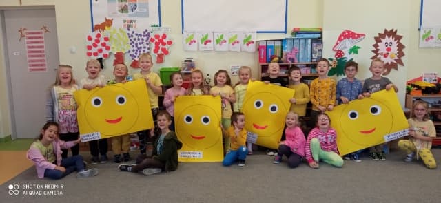 Światowy Dzień Uśmiechu obchodzimy zawsze w pierwszy piątek października. Pomysłodawcą tego święta był Harvey Ball, który w 1963 roku stworzył charakterystyczny uśmiech - uśmiechniętą buzię na żółtym kole. Dzieci tego dnia robiły różne rzeczy, które wywoływały uśmiech na ich twarzach. Rozmawialiśmy o tym czy lubią się uśmiechać, jakie emocje kojarzą im się z uśmiechem, co sprawia, że się uśmiechają. W grupie na dzieci czekał tor przeszkód, który trzeba było przejść z uśmiechem od ucha do ucha. W grupach tworzyły uśmiechnięte buźki z cytatami " Uśmiech to zdrowie", " Uśmiech jest zaraźliwy" , " Podziel się uśmiechem" itp. Głównym celem jest uświadomienie dzieciom znaczenia optymistycznego podejścia do życia. Uśmiech nic nas nie kosztuje, a jak wiele może znaczyć dla drugiego człowieka. Dzielmy się nim, każdego dnia. Wszystkim przedszkolakom życzymy, aby uśmiech gościł na ich twarzy zawsze, nie tylko od święta.