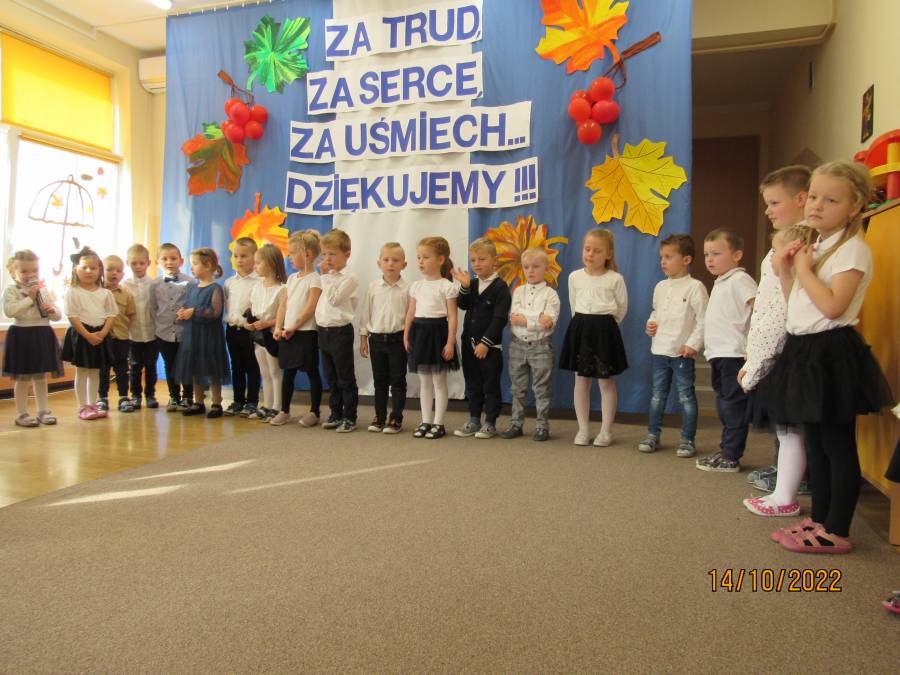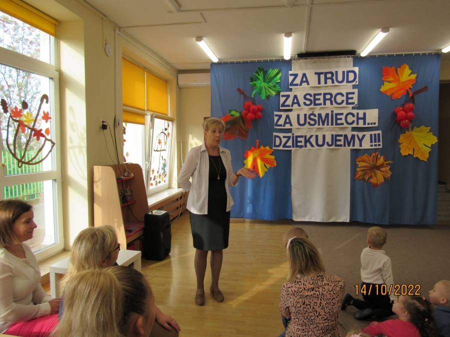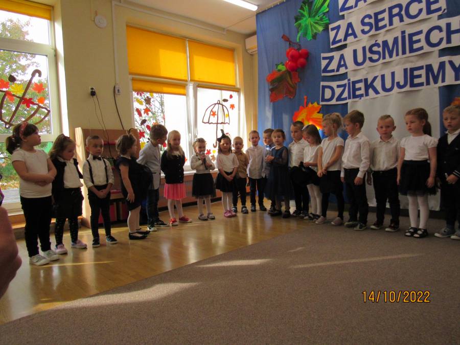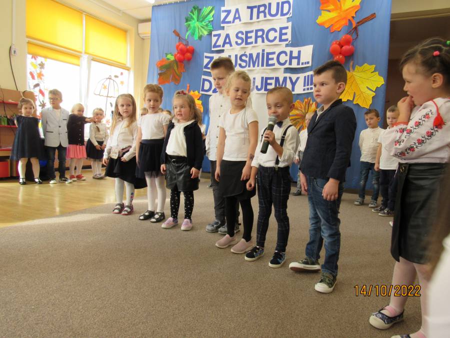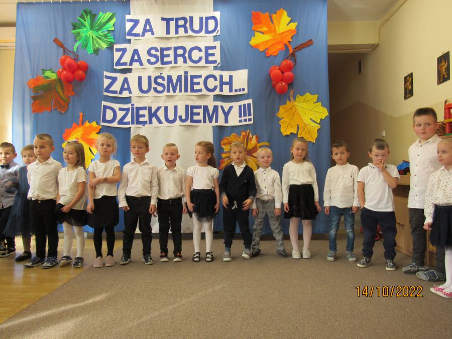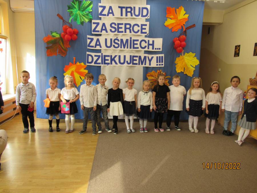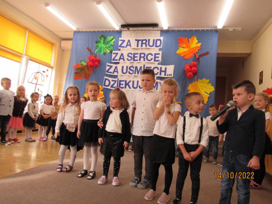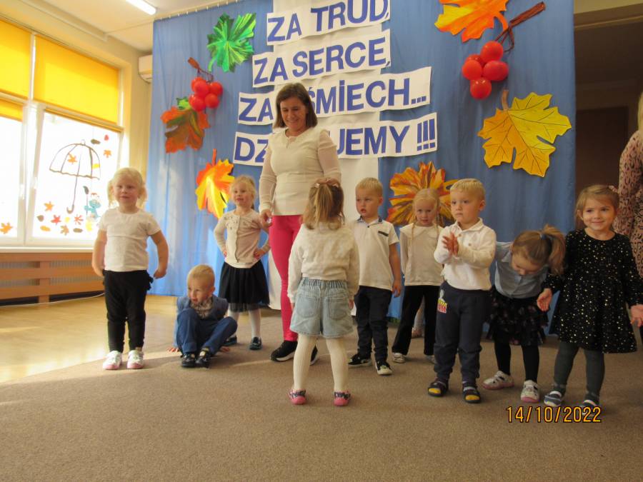 W naszym przedszkolu uroczystość z okazji Dnia Edukacji Narodowej odbyła się 14 października. Uczestniczyli w niej zaproszeni goście, pracownicy przedszkola, przedszkolaki ze wszystkich grup oraz przedstawiciele rodziców. Uroczystość rozpoczęła pani dyrektor, która powitała zebranych, złożyła wszystkim pracownikom życzenia. Podziękowała za codzienny trud, zaangażowanie, czujność a także za poświęcenie i troskę o dobro wychowanków i zaprosiła do obejrzenia programu artystycznego przygotowanego przez dzieci ze wszystkich grup. Przedszkolaki najpiękniej jak potrafiły podziękowały swoim paniom i wszystkim pracownikom za uśmiech, serce i poświęcenie.