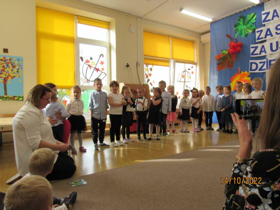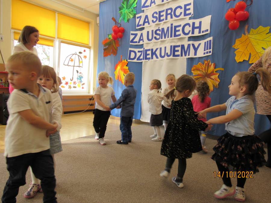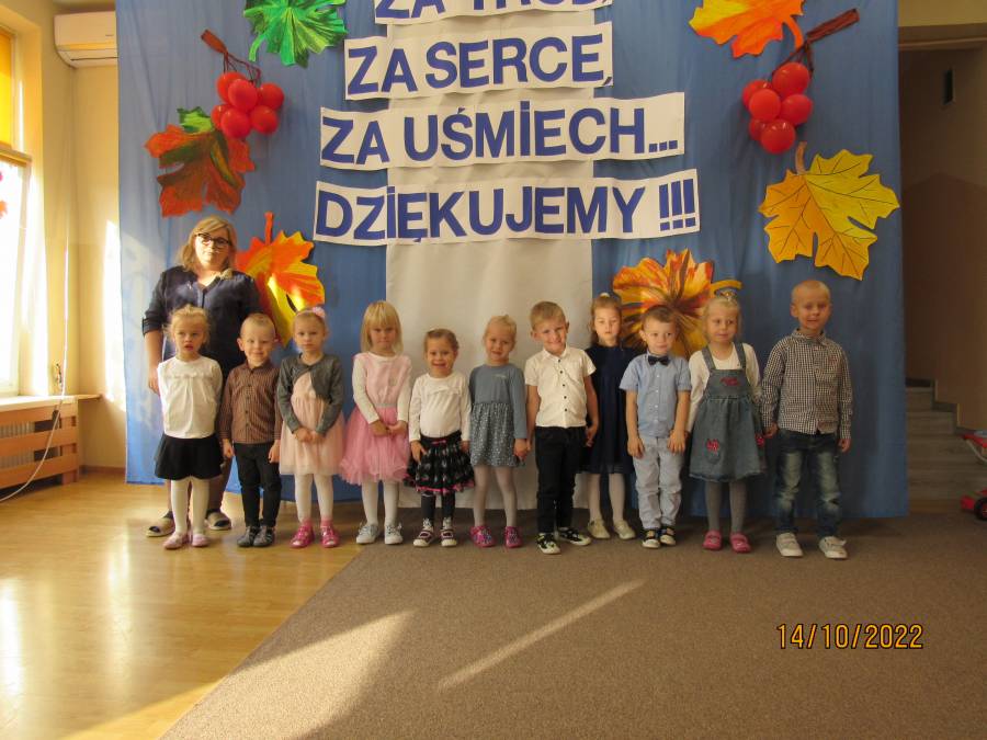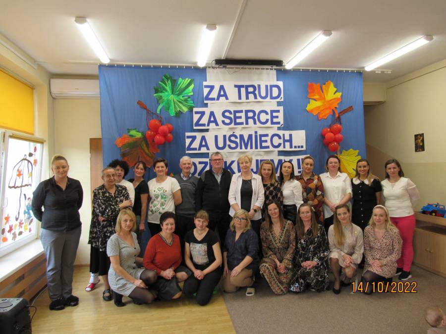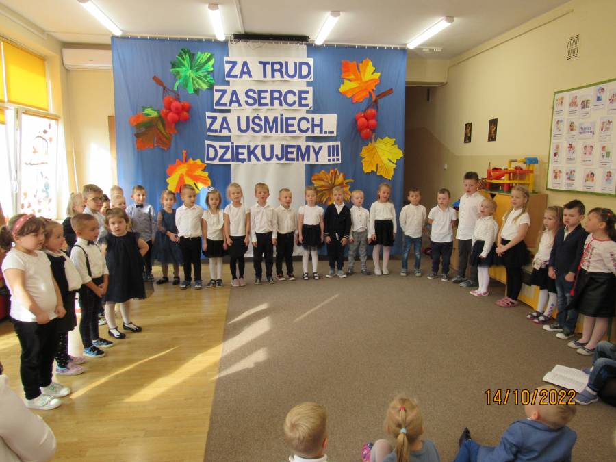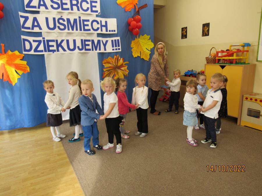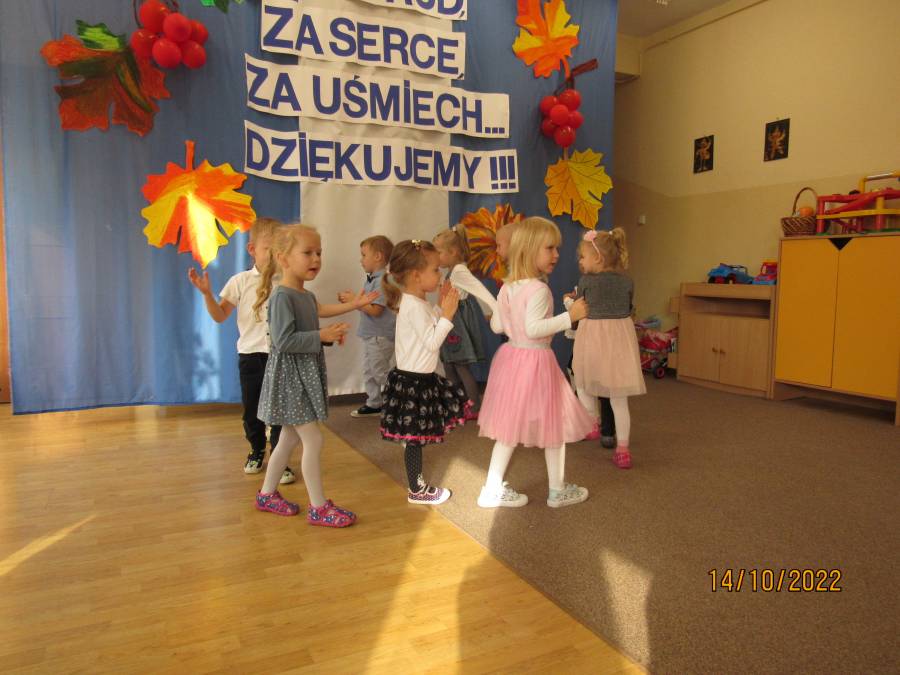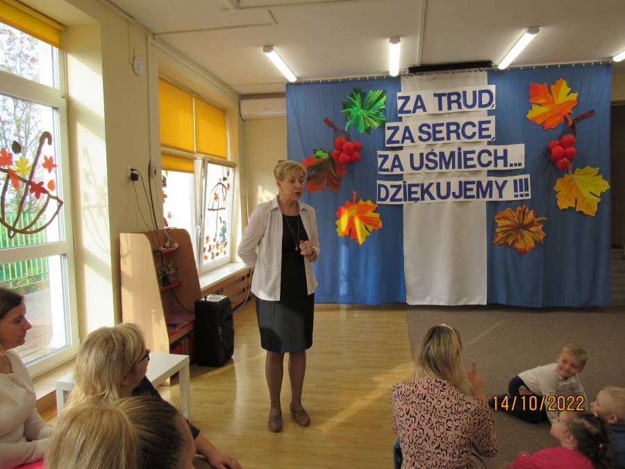 W naszym przedszkolu uroczystość z okazji Dnia Edukacji Narodowej odbyła się 14 października. Uczestniczyli w niej zaproszeni goście, pracownicy przedszkola, przedszkolaki ze wszystkich grup oraz przedstawiciele rodziców. Uroczystość rozpoczęła pani dyrektor, która powitała zebranych, złożyła wszystkim pracownikom życzenia. Podziękowała za codzienny trud, zaangażowanie, czujność a także za poświęcenie i troskę o dobro wychowanków i zaprosiła do obejrzenia programu artystycznego przygotowanego przez dzieci ze wszystkich grup. Przedszkolaki najpiękniej jak potrafiły podziękowały swoim paniom i wszystkim pracownikom za uśmiech, serce i poświęcenie.