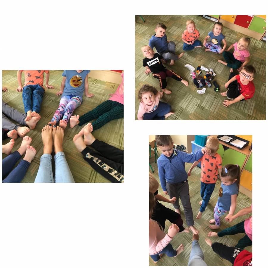 21 października obchodzimy ?Dzień bez skarpetek?. Dzieci z grupy Skrzaty także postanowiły to święto uczcić. Na początku zajęć dzieci dowiedziały się dlaczego tak ważne jest dbanie o kondycję swoich stóp następnie przystąpiły do ćwiczeń praktycznych. Skrzaty miały okazję poćwiczyć sprawność swoich stópek stąpając po ścieżce wykonanej z różnych materiałów naturalnych. Stopy się przytulały, głaskały, sprawdzały, czy lewa stopa ma tyle samo paluszków co prawa. Nie obyło się też bez zabaw ruchowych przy piosence ?Praczki?. Nie zabrakło zabawy polegającej na dopasowaniu do siebie takich samych skarpetek. ?Dzień bez skarpetek? dostarczył wiele wrażeń, wszelkie bariery zostały przełamane, a Skrzaty bawiły się wyśmienicie.