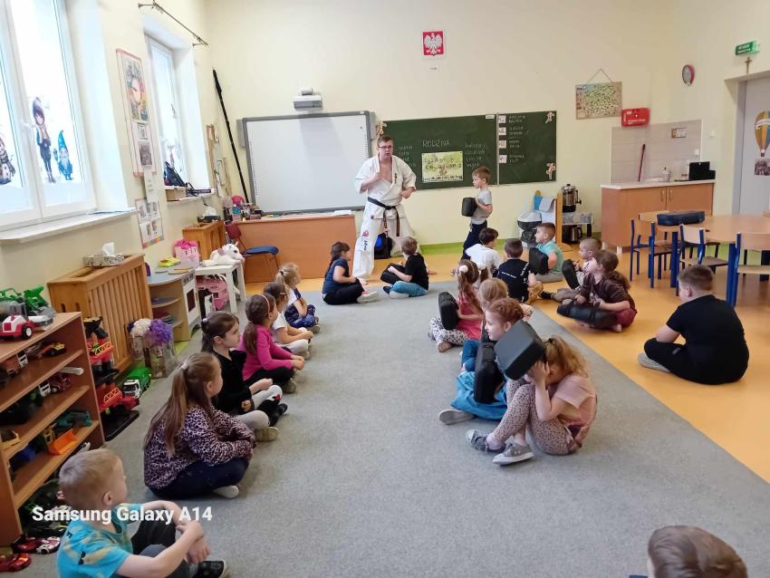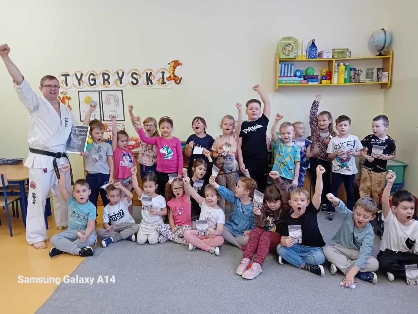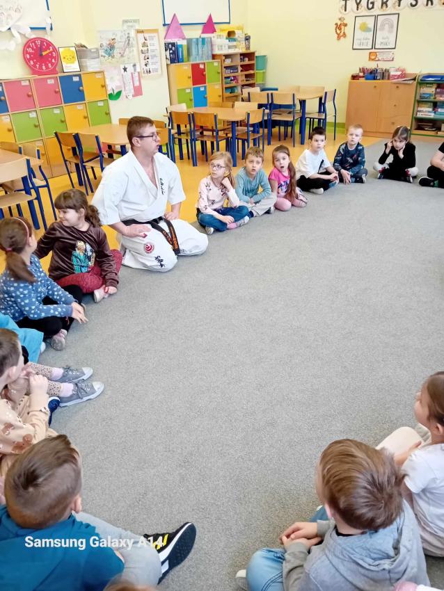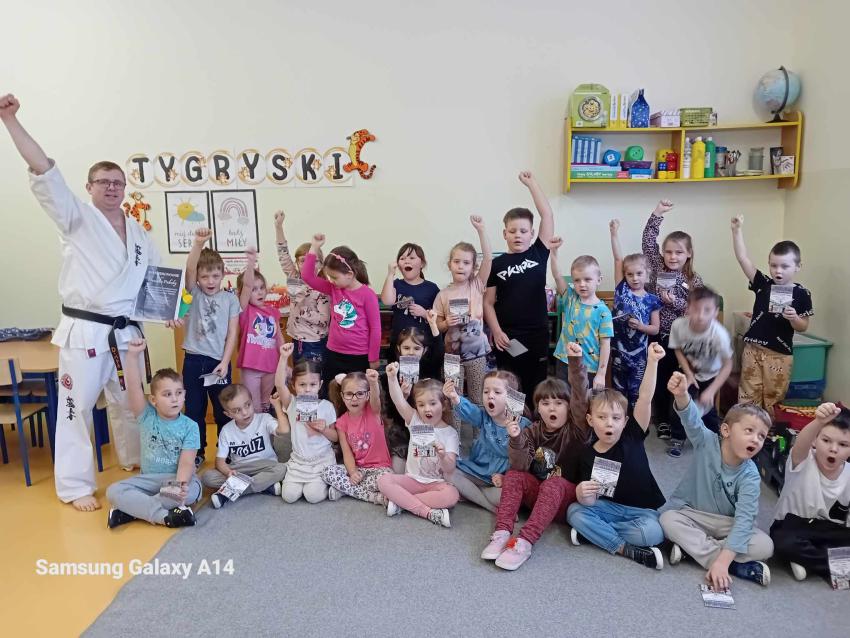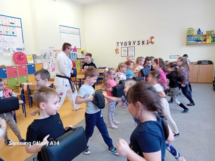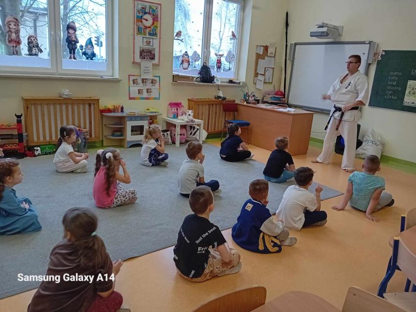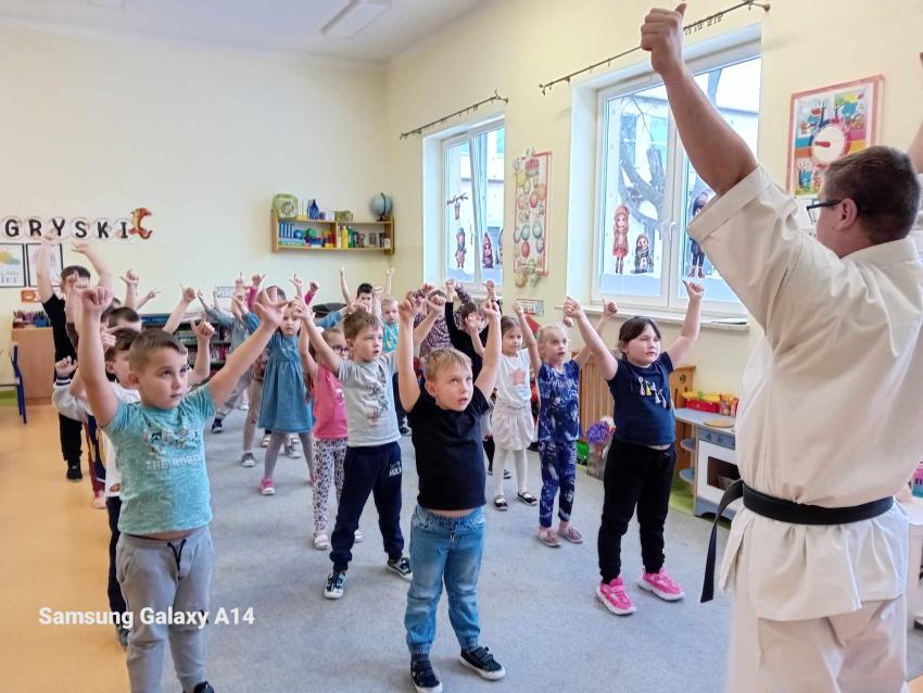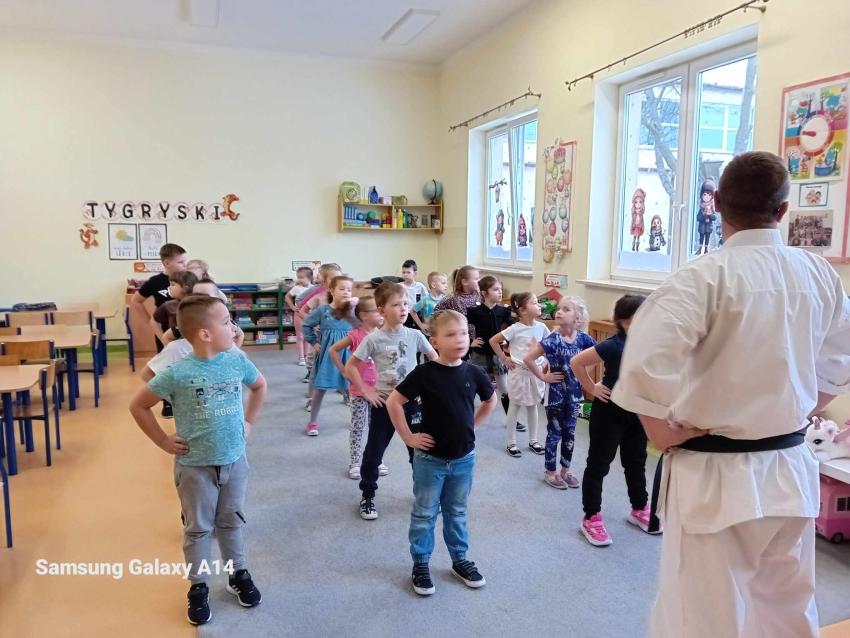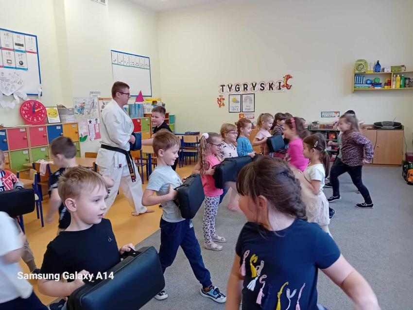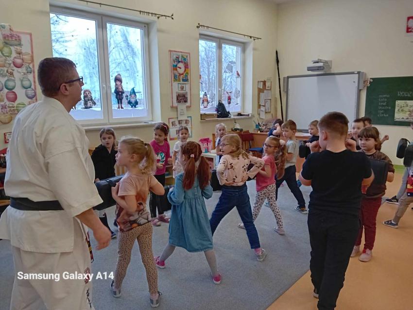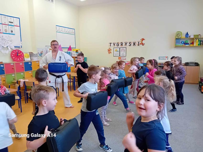 22 stycznia dzieci z grupy ?Tygryski? w ramach realizacji działań wspierających aktywność w zakresie rozwijania sprawności fizycznej i zdrowotnej, gościły pana Daniela Pakułę, trenera z Wielkopolskiego Klubu Karate Kyokushin w Malanowie. Dzieci dowiedziały się skąd wywodzi się karate, poznały podstawowe słowa w języku karateków, uczestniczyły w rozgrzewce i treningu, podczas którego mogły poczuć się choć przez chwilę karateką. Zajęcia były dla tygrysków wielką frajdą i wzbudziły wśród nich duże zainteresowanie.